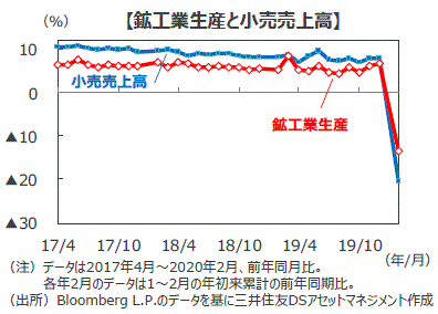 ■1~2月の小売売上高は前年同月比▲20.5%と、市場予想の同▲4.0%を大幅に下回り、昨年12月の同+8.0%から失速しました。新型コロナウイルスの感染拡大で小売店、飲食店が休業を余儀なくされたことなどが響きました。