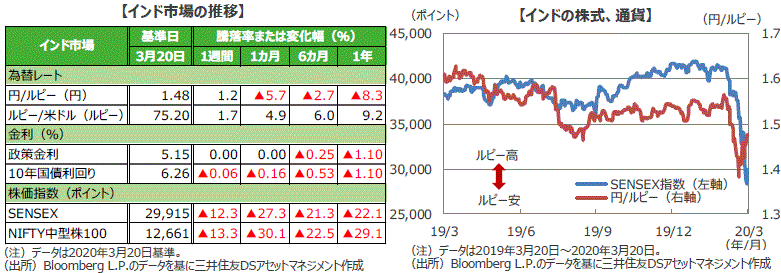 ■新型コロナ対策により、経済への影響が深刻になるリスクがあります。インドの通貨ルピーの対米ドル相場が過去最安値を更新するなか、当面株式市場からの資金流出圧力が続きそうです。一方で、株式市場の急落に伴い、予想ベースの株価収益率(PER)は14年以来の13倍台、株価純資産倍率(PBR)は13年以来の2.3倍に低下するなど、株価のバリュエーションに割安感が出ていることが下値を支えると期待されます。