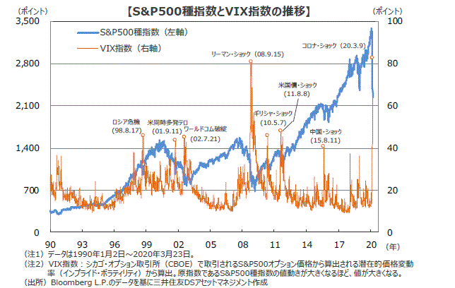 ■ただし、年後半は景気の持ち直しが予想されます。中国では積極的な投資拡大を進める方針で、4-6月にリバウンドが期待されます。一方、米国、欧州は足元で感染が拡大していることから4-6月にかけてはどの程度の悪化で食い止められるかが重要です。各国・地域で積極的な金融・財政政策が年後半の景気回復をけん引すると考えられます。楽観はできませんが、足元で景気に対する自信と期待が回復するためには、効果的な治療薬の登場と新型ウイルスの感染のピークアウトが待たれます。VIX指数は23日現在61.59と依然高いものの若干低下しました。グローバルベースで新規感染者数が減少に転じれば、いったんは安心感が広がる可能性があると思われます。