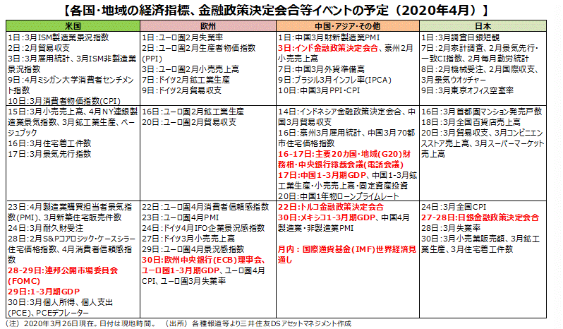 ■国際通貨基金(IMF)から世界経済見通しが公表されます。前回1月公表時点では2020年の世界成長見通しは3.3%と10月時点予測から下方修正されましたが、その後、新型コロナウイルスによる感染が世界的に拡大した影響から、さらなる大幅な下方修正が行われる見込みです。