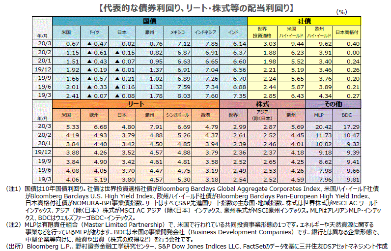 ■株式市場では、新型コロナの感染拡大を受けてパニック的な売りが広がったため、株式の配当利回りが上昇しました。流動性の低いBDC、MLPの配当利回りは、価格が大きく下落したため、ともに大幅に上昇しました。