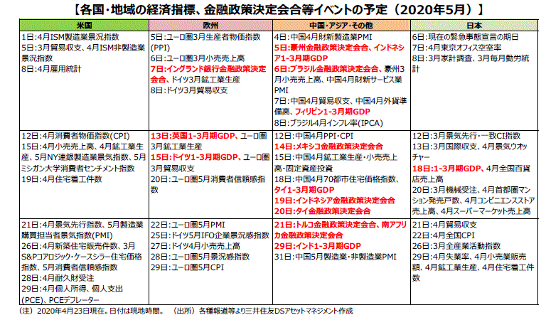 ■世界的な新型コロナ感染拡大は中国をはじめ米国やドイツでは鈍化してきており、これらの国々では大規模なロックダウン(都市封鎖)によって止まっていた経済活動の再開が模索されています。第2波(感染の再拡大)も懸念されるため、ワクチンが開発され新型コロナ終息が見通せるまでは、感染拡大のコントロールと行動制限の緩和の微妙な舵取りが必要です。英豪や新興国各国では金融政策決定会合が予定されていますが、感染拡大の影響で景気が冷え込んでいるため、緩和的な金融政策が継続されるとみられます。