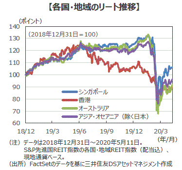 ■アジア・オセアニアのリート市場は3月に大きく下落した後、反発傾向にあります。5月11日現在で、アジア・パシフィック・リート指数(除く日本、現地通貨ベース)は3月末比+10.5%、香港は同+4.3%、シンガポールは同+8.5%、オーストラリアは同+15.6%となりました。新型コロナ感染拡大が鈍化してきたことや、一部の国で経済活動の再開に向けロックダウン(都市封鎖)の解除などの動きがみられはじめたためです。