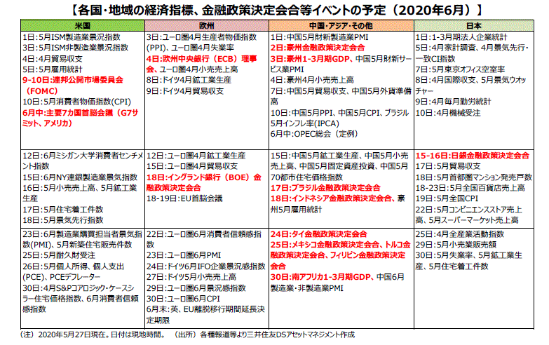■新型コロナ感染拡大はピークを越えたとみられる国々も多く、世界経済は再開へと動きつつあります。一方で、ワクチンは実用化前のため、経済再開に伴い感染第2波が懸念されることや、ブラジルやロシアなど足元で感染が急拡大している国もあることから、今後も感染拡大のコントロールと経済再開の難しい舵取りが続きそうです。各国・地域の金融政策決定会合では引き続き緩和的な金融政策が継続され、経済支援のための政策が打ち出されるとみられます。今後改善が見込まれる主要国の経済指標の改善ペースが注目されます。