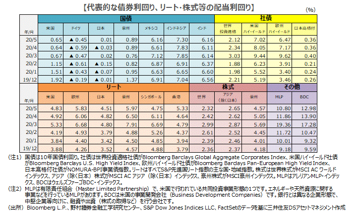 ■株式市場やリート市場は、リスク選好姿勢の強まりを受けて堅調に推移しました。これに伴い、株式、リートの配当利回りは低下しました。ただ、香港リート、アジア株式(除く日本)の配当利回りは上昇しました。中国全人代で香港の統制を強化する国家安全法制が発表されたことや米中の対立の深刻化懸念が重石となり、価格が下落したためです。