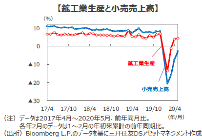 ■中国経済は新型コロナの影響で1-3月期に深刻な打撃を受けたものの、いち早く感染拡大の封じ込めに成功し、生産主導で徐々に回復しつつあります。ただ、国家統計局は、世界経済が厳しさを増しており、経済運営が多くのリスクと困難に直面していると述べ、消費者の感染に対する警戒心などから、消費の見通しについてやや慎重な見方を示しています。こうした中、弊社は、生産に比べて出遅れている投資と消費が7-9月期に、コロナショック以前の水準(昨年12月時点)を回復すると予想しています。