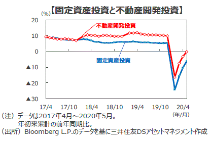 ■1~5月の固定資産投資は前年同期比6.3%減と、1~4月の10.3%減から減少率が縮小しました。内訳をみると、堅調なマンション販売などから、不動産開発投資が前年同期比0.3%減と、ほぼ前年並みまで回復しました。
