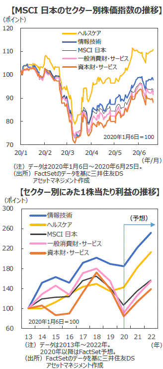 ■軟調となった日本株式市場ですが、セクター別にみると「ヘルスケア」は堅調で、「情報技術」の下落も小幅に留まっています。業績面でも両セクターがけん引役です。「情報技術」の20年の対前年比の減益率は他のセクターに比べて相対的に低い上に、21年、22年は過去最高益を更新する見通しです。また、「ヘルスケア」は20年に増益となる見通しで、その後も過去最高益を更新すると予想されます。