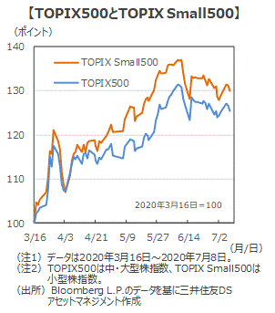 ■日本株式市場は、新型コロナウイルスの感染拡大と経済活動の自粛の影響が懸念されつつも、3月16日の年初来安値以降、6月中旬まで堅調な推移となりました。主要国・地域が大幅な金融緩和と積極的な財政政策を推し進めたことが背景です。特に米国株式市場がウィズコロナ関連銘柄を中心に大幅に上昇したことで、日本の小型株市場にも追い風となりました。小型株の動きをTOPIX Small500で確認すると、6月10日の戻り高値まで36.9%の上昇を達成しました。中でも小型株のグロース指数の上昇率は42.9%に達しました。中型・大型株の動きを代表するTOPIX500の戻り高値までの上昇率が31.4%でしたので、これを大きく上回ったことになります。