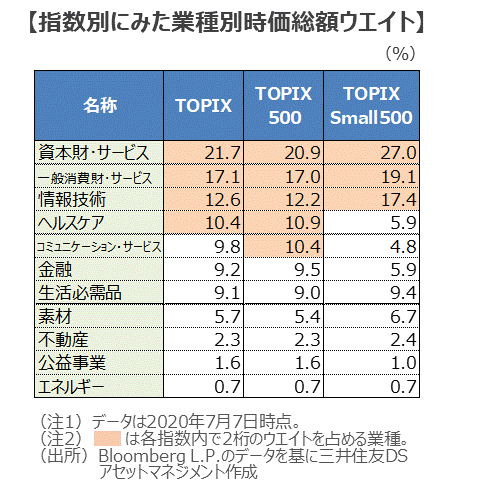 ■ウィズコロナ時代の株式市場をリードするセクターは、「情報技術」と「ヘルスケア」です。TOPIX Small500は、中・大型株の指数に比べると、「情報技術」のウエイトは高いのですが、「ヘルスケア」のウエイトが低いという特性があります。一方、「資本財・サービス」のウエイトが高いことを鑑みると、7-9月期以降の世界経済の回復が大きくなれば、生産の盛り返しと業績の改善期待も高まり、小型株が反騰する可能性はあると思われます。米国経済・株式市場、新型コロナの感染状況を意識した展開が続く中、企業活動がいつ本格化するかに注目したいと思います。