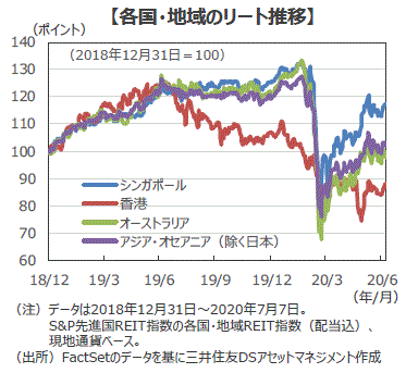 ■足元のアジア・オセアニアのリート市場はすべての地域で上昇しました。香港も反発に転じました。7月7日現在、アジア・パシフィック・リート指数(除く日本、現地通貨ベース)は5月末比+3.5%、香港は同+14.6%、シンガポールは同+3.2%、オーストラリアは同+0.8%となりました。
