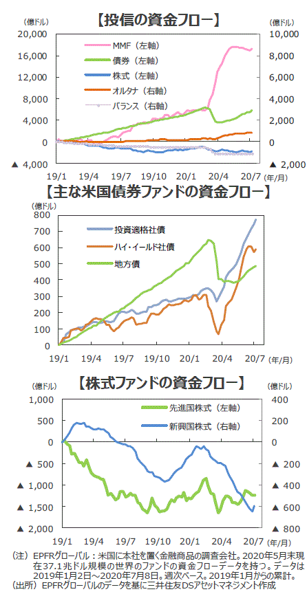 ■債券ファンドは「米国」への流入が続いています。特に「投資適格社債」、「ハイ・イールド社債」といったクレジットファンドへの流入が顕著です。米連邦準備制度理事会(FRB)が個別企業の社債購入を開始したことなどから安心感が広がっています。