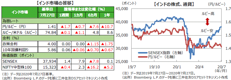 ■7月のインド株式市場は、前月からのリスクオン(選好)相場が継続し、堅調な展開となりました。月初より、中国の景気回復や株式市場への資金流入期待を背景に中国株式相場が大きく上昇したことを受けて、投資家心理が強気に傾き、インドを含めアジアの株式市場は強含みました。代表的な株価指数のSENSEX指数は、前月末の34,915ポイントから上昇基調となり、23日には企業業績が好感されて38,140ポイントで引け、約4カ月半ぶりの高値を付けました。インドでは新型コロナウイルスの新規感染者が急拡大していますが、追加経済政策や景気回復への期待が投資家心理を支えています。