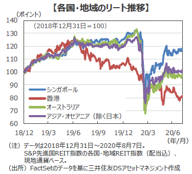 ■新型コロナ感染拡大の影響でネット販売需要が高まり、7月は世界的に物流施設リートが上昇、商業施設リートやホテルリートが下落し、アジア・オセアニアリート市場でも同様の傾向がみられました。ウィズコロナの環境下、当面この傾向は続くと見込まれます。