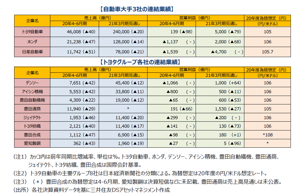 ■新型コロナの感染拡大による需要急減で2020年4-6月期は世界の大半の自動車メーカーが最終赤字を計上しましたが、トヨタ自動車は大幅な減益ながら営業利益139億円、純利益1,588億円の黒字となり収益力の強さが際立つ結果となりました。いち早く販売回復につなげたことや原価低減を進め損益分岐点を引き下げたことなどが寄与しました。ホンダと日産自動車は営業赤字となりました。