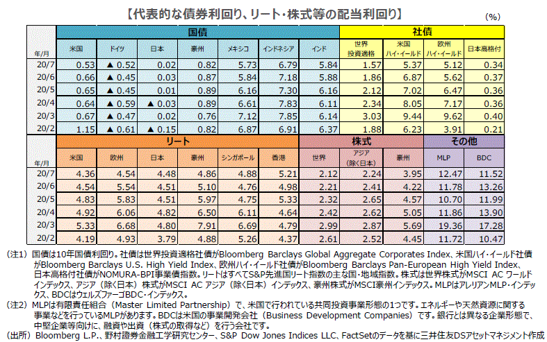 ■7月の主要資産の利回りは、引き続き低下しました。世界で新型コロナウイルスの感染拡大が続くなか、中央銀行の超金融緩和政策の長期化観測などが好感され、各国の国債利回りは低下しました。また、超金融緩和の長期化観測を受けて、投資家のリスク選好姿勢が強まったことから、株式などのリスク性資産も堅調に推移し、配当利回りが低下しました。