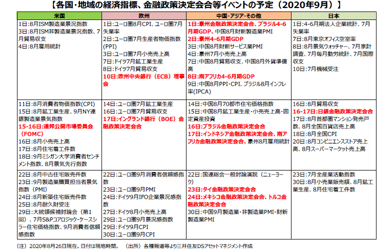 ■9月の米連邦公開市場委員会(FOMC)では金融緩和の強化が注目されます。フォワードガイダンスの強化と資産大量買入などの追加緩和が実施されるとの見方があります。また、29日には大統領候補の第1回討論会が行われます。全3回開催される公開討論会は選挙に大きな影響を及ぼすとされており、接戦が予想されるトランプ、バイデン両候補の発言が注目されます。