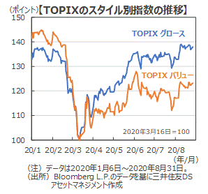 ■TOPIXをスタイル別にみると、3月以降、バリュー指数はグロース指数をアンダーパフォームしていましたが、8月はバリュー指数が同+10.0%、グロース指数が同+6.7%とバリュー指数がグロース指数を上回りました。