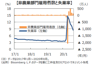 ■米労働省が9月4日に発表した8月の雇用統計によれば、失業率は8.4%と前月の10.2%から1.8ポイント低下し、5カ月ぶりに10%を下回りました。市場予想(9.8%)を大きく上回る改善となりました。一方、非農業部門雇用者数は前月比137万人増と、事前の市場予想(135万人増)に沿った結果となり、前月の173万人増から更に鈍化したものの、4カ月連続の改善となりました。
