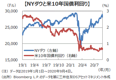 ■米国株式市場は今月3日以降軟調に推移していますが、ここまでの株価上昇に対するスピード調整の可能性が高いと考えられます。米国経済は緩やかながら回復傾向にあり、金融・財政両面から強力なサポートが入っていることから、株式市場の下落は短期的な調整に留まり、次第に回復に向かうと考えられます。