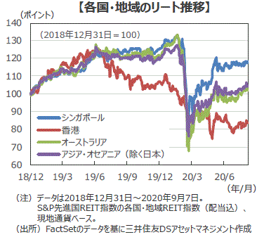 ■シンガポールは、政府の徹底した感染対策が国の相対的な評価を高めており、商業施設、ホテルのリートは底堅く推移すると予想します。オーストラリアは、決算を織り込み一旦材料出尽くしとみられますが、成長期待の高い銘柄への評価は持続すると見込まれます。旺盛なEコマース需要を背景に、効率的な大型物流施設の開発ニーズは続くとみられます。香港リート市場は、8月28日に政府がソーシャル・ディスタンス規定を緩和した後の動向をみながらの推移を予想しています。