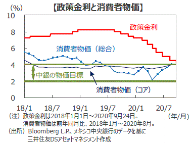■先月、同行のディアスデレオン総裁が利下げの可能性を示唆していましたが、直近発表された8月の消費者物価指数が前年同月比+4.05%と、中央銀行の政策目標の上限(4%)を上回ったことから、利下げに対する見方は分かれていました。同行は、足元の物価上昇を認めつつも、1~2年先の期待インフレ率を3%と予想したことから、新型コロナの感染拡大で大幅に落ち込んだ経済に対応し、追加利下げに踏み切ったと考えられます。