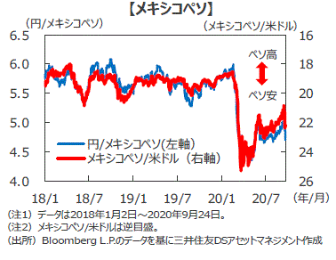 ■メキシコペソは7月以降、世界的な景気回復期待の高まりを背景に反発してきました。世界経済は各国・地域の積極的な金融・財政政策によって緩やかに回復すると考えられ、メキシコペソは今後も堅調な展開が見込まれます。但し、新型コロナの感染再拡大や米中摩擦の先鋭化などからリスク回避的な動きが強まれば、メキシコペソの上値が抑制されると考えます。また、メキシコ国内の物価上昇については注意が必要と考えます。