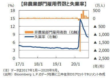 ■米労働省が10月2日に発表した9月の雇用統計によれば、市場の注目度が高い非農業部門雇用者数は前月比66.1万人増と、5カ月連続で改善したものの、事前の市場予想(86万人増)を下回りました。米国の雇用は経済活動の再開に伴って改善が続いていますが、今回は改善の幅が小幅にとどまり、雇用回復の足取りが鈍くなっています。