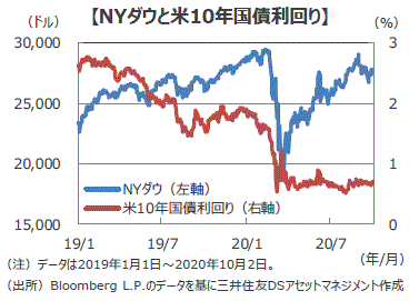 ■リアル・クリア・ポリティクスがまとめる世論調査平均(10月4日時点)によれば、トランプ大統領のコロナ感染を受けて、大統領選のバイデン氏のトランプ氏に対するリードはさらに拡大しました。株式市場はバイデン氏勝利を警戒していますが、仮にバイデン候補が当選し、大統領も議会も民主党が押さえると、財政支出が増え、景気が活発化することによって、経済が正常化に向かうとも考えられ、株式や長期金利の上昇につながる可能性もあります。このように、選挙結果に影響し、金融市場にも大きな影響が及ぶ可能性があるため、トランプ大統領が早期に治癒出来るか、選挙にどういった影響が出るかは極めて重要で、注目が続くと思われます。