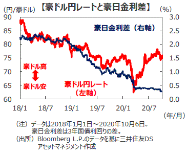 ■足元、豪州では新型コロナの感染拡大が抑制されてきており、緩やかな景気回復が予想されます。こうした状況のもと、中長期的に見た豪ドルの上方トレンドは今後も継続していくと見られます。しかし、大統領選挙を前にして米国金融市場が神経質な動きとなる可能性が高まっていることに加え、RBAの追加緩和観測も豪ドルの上値を抑えると見られます。短期的な豪ドル相場は横ばいでの推移が予想されます。