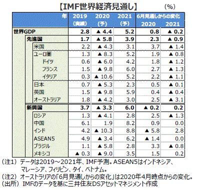 ■IMFは上述の通り、各種要因により上振れ下振れの可能性はあるものの、2021年の世界経済成長率は+5.2%へ回復するとしています。弊社は2020年▲4.0%、2021年+6.2%の成長率を見込んでいます。今後は、ワクチン開発の進展を待ちつつ、新型コロナの感染状況と経済再開のバランスをとりながら世界経済が緩やかに回復に向かうことを確認する展開となりそうです。