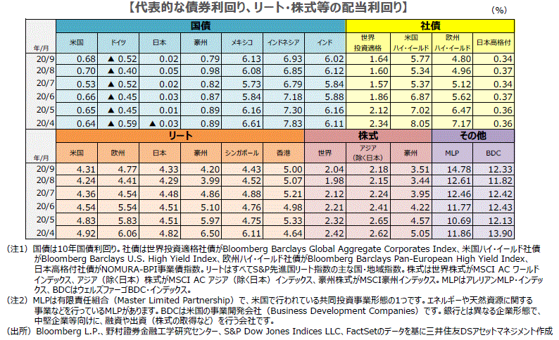 ■主要国の株式市場やリート市場は、リスク回避的な動きが強まり軟調に推移したため、株式、リートの配当利回りは上昇しました。市場をけん引してきた米国のテクノロジー関連株が高値警戒感から下落したことに加え、米中対立の激化や、米国の追加経済対策法案の協議が難航し、成立の遅れが懸念されたことなどが背景です。