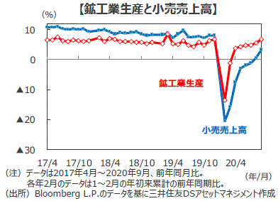 ■9月の小売売上高は前年同月比+3.3%と、8月の同+0.5%から大きく伸びました。新型コロナの影響で飲食業などは未だマイナスですが、自動車や化粧品などの販売は堅調な動きとなりました。