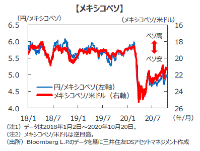 ■メキシコペソは7月以降、世界的な景気回復期待の高まりを背景に反発してきました。市場にリスク回避的な動きが広がった9月は下落しましたが、総じて上昇基調を維持しています。各国・地域で積極的な金融・財政政策が実施される中、メキシコでも9月に11会合連続となる利下げが決定されましたが、市場の利回りを追求する動きが、先進国比金利水準が高いメキシコペソの支援材料になっているとみられます。