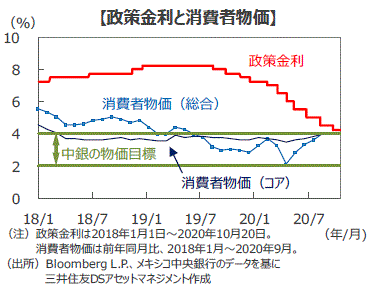 ■世界的な金融緩和環境、利回り追求の動きなどから、メキシコペソは引き続き底堅く推移することが見込まれます。ただし、新型コロナの感染再拡大や米中対立の深刻化などからリスク回避的な動きが強まれば、メキシコペソの上値は抑制されると考えます。また、メキシコ経済は米国経済の影響を大きく受けるため、米大統領選や景気の動向には注意が必要です。足元上昇しているメキシコの物価についても同様です。