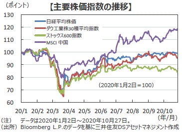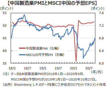 ■中国経済は生産活動に加え、遅れていた消費・投資活動も回復に向かったことから、概ね新型コロナ前の状況を取り戻しつつあり、持ち直してきた企業業績も一層の改善が見込まれます。足元では、欧米を中心とした新型コロナの感染再拡大や米中摩擦の先鋭化が懸念されますが、今後は、堅調な国内需要に加え、世界経済の回復に伴う外需の持ち直しが予想されることから、中国株式は更なる上値を目指す展開を想定します。