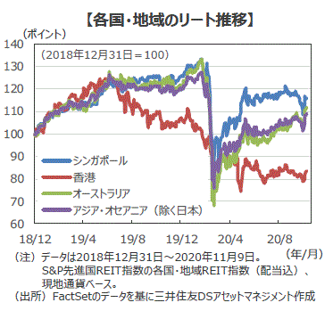 ■しかし11月3日以降は米大統領選を巡る不透明感がやや解消し、市場にリスク選好的な動きが広がったことなどから上昇に転じました。9日現在、アジア・パシフィック・リート指数(除く日本、現地通貨ベース)は9月末比+4.5%、香港は同+0.4%、シンガポールは同▲0.7%、オーストラリアは同+8.5%となっています。