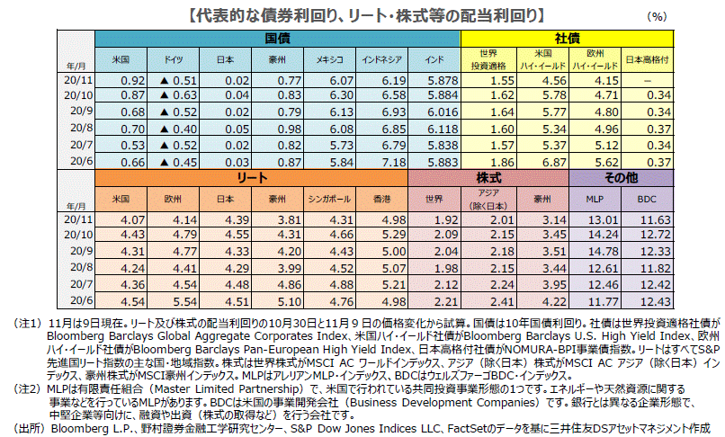 ■11月3日に米大統領選挙が実施され、バイデン氏が勝利しました。今週に入り、世界の株式市場が大きく上昇する中、9日に米大手製薬会社のワクチンに対する期待が高まったことで、再び世界の株式市場は上昇、米国では長期金利が上昇しました。9日現在、リスクオンの流れが強まっており、社債利回りが大きく低下しているほか、リート、株式等の利回りも低下しました。