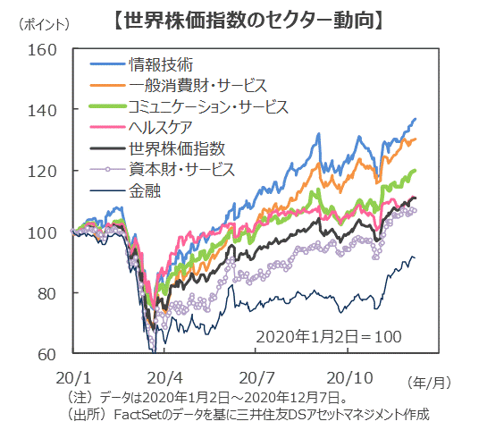 ■11月以降はこれまで出遅れていた「エネルギー」、「金融」、「素材」の巻き戻しが目立ちます。11月9日から12月7日までの世界株価指数の上昇率が5.3%で、これを上回ったセクターは4つあり、「エネルギー」が16.6%、「金融」が8.5%、「素材」が7.6%、「情報技術」が6.5%でした。経済の正常化を背景として上昇したセクターに加えて、「情報技術」も市場平均を上回っている点が大きな特徴と言えます。