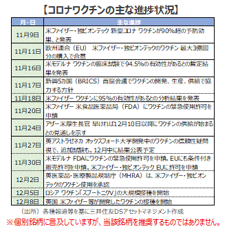 ■世界の株式市場は、新型コロナウイルスのワクチンの実用化が近づきつつあることから、11月以降上昇スピードが速まりました。11月9日に、米ファイザーと独ビオンテックが開発したワクチンの有効性が90%超と発表されたことを皮切りに、米モデルナ、英アストラゼネカとオックスフォード大学など、立て続けに高い有効性の発表が相次ぎました。ワクチンの実用化に向けた動きが次々と発表されたことで、コロナ禍から脱却し、経済の正常化に近づくための着実な一歩として、市場のリスク許容度が一段と高まりました。