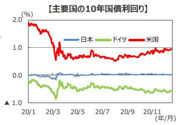 ■2021年の世界経済は、新型コロナワクチンの実用化に伴い、回復することが見込まれます。ただし、需給ギャップが残るためインフレ圧力は高まらず、FRBをはじめとする各国・地域の中央銀行は、大規模緩和を継続するとみられます。このため景気回復の下でも世界の長期金利の上昇は緩やかにとどまる見通しです。