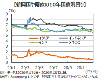 ■主要国に比べて信用力の低い新興国の長期金利も新型コロナの影響に伴う金融緩和を受けて3月にかけて低下しましたが、その後財政悪化懸念から上昇する国もありました。ただ、FRBの異例の金融緩和でドル安基調となるなか、コロナワクチン開発による景気回復期待から新興国債券市場に資金が流入したことを背景に、年末にかけて新興国の長期金利は一段と低下しました。