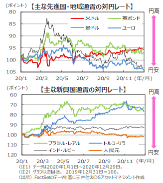 ■2021年の米ドル円相場は、米ドル安・円高の流れが続いた後、年後半にかけて米景気が回復するにつれて、米長期金利が緩やかに上昇し、米ドル高・円安へ転じる見通しです。また、米連邦準備制度理事会(FRB)による将来的な資産購入額の段階的な縮小(テーパリング)から米ドルの供給超過状態の修正が意識されれば、それも米長期金利の上昇要因になり、米ドル高・円安へ作用すると予想されます。ユーロは、感染拡大による景気の先行き懸念や欧州中央銀行(ECB)の大規模な金融緩和政策が重石ですが、ワクチン効果や復興基金による投資拡大への期待がユーロの支援材料となる見通しです。新興国通貨は、経済の回復ピッチ、政治リスクなどにより選別色が強まると見込まれます。