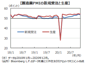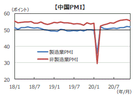 ■中国国家統計局が発表した20年12月の製造業購買担当者景気指数(PMI)は51.9となり、前月から0.2ポイント低下したものの、景気の拡大・縮小を判断する節目の50を10カ月連続で上回りました。製造業PMIは、中国景気の回復と海外景気の持ち直しを背景に、全体的に安定した回復を続けています。