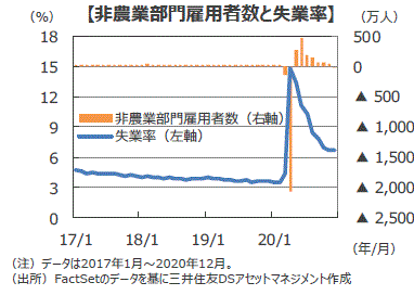 ■米国では新型コロナの感染再拡大に伴い、各州で行動制限が課されていることから、飲食を含む余暇・娯楽を中心に、雇用市場の改善に急ブレーキがかかりました。