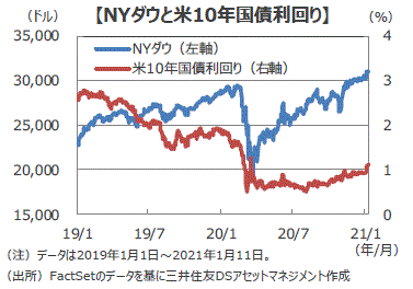 ■今後、新型コロナワクチンの有効性に疑問符がつくような状況に陥れば市場のセンチメントが一変するリスクもありますが、新型コロナの収束が期待できる状況が続けば、弱めの経済指標が出ても、積極的な金融・財政政策への期待から、米株の堅調さが続く可能性があります。また、今週から始まる10-12月期業績発表で企業の収益力の高さが示されれば、さらに株価を押し上げることが見込まれます。