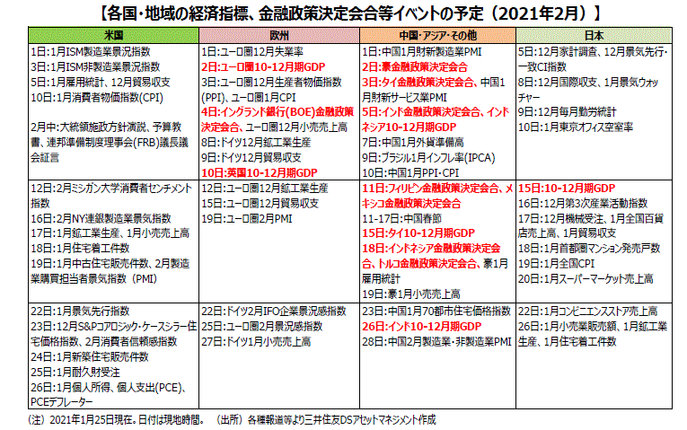 ■米国ではバイデン新政権が始動し、「パリ協定」への復帰など前政権の政策からの大幅転換が行われています。一方、対中政策は、追加関税については前政権より融和的とみられますがテクノロジーや軍事覇権、人権等ではより強硬的な姿勢で対峙する可能性があります。追加経済対策の先行きにも注視が必要です。