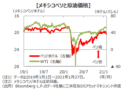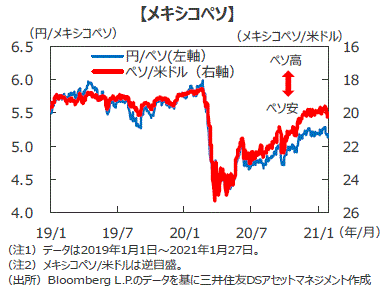 ■1月26日発表の国際通貨基金(IMF)の経済見通しによれば、2021年のメキシコの成長率は前年比+4.3%と、昨年10月の前回予測から0.8ポイント上方修正されました。IMFは、米国などの追加経済対策やコロナワクチンの普及を踏まえて2021年の世界の成長率を引き上げており、バイデン米政権による経済対策で米景気が回復すればメキシコ経済も恩恵を受けるとみていると思われます。メキシコ経済の停滞からの脱却ペースは依然として弱いものの、メキシコペソは景気回復期待から今後も堅調な展開が見込まれます。