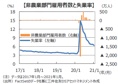 ■但し、雇用低迷の主な要因は新型コロナの感染再拡大です。今後、コロナワクチン接種の普及により行動制限は緩和されると考えられ、追加の経済対策実施も想定されることから、先行き雇用情勢は改善し、米国景気の回復は続くとみられます。