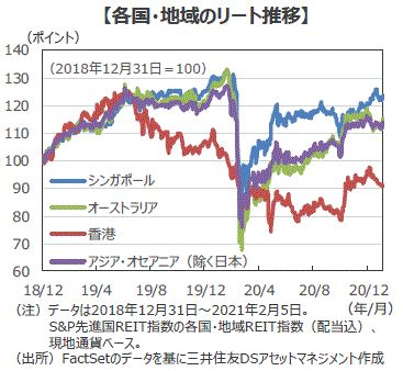 ■2021年1月のアジア・オセアニアのリート市場は、シンガポールを除き下落しました。その後オーストラリアはやや反発しましたが、2月5日現在、アジア・パシフィック・リート指数(除く日本、現地通貨ベース)は12月末比▲1.1%、香港は同▲3.6%、シンガポールは同+1.9%、オーストラリアは同▲2.1%となっています。